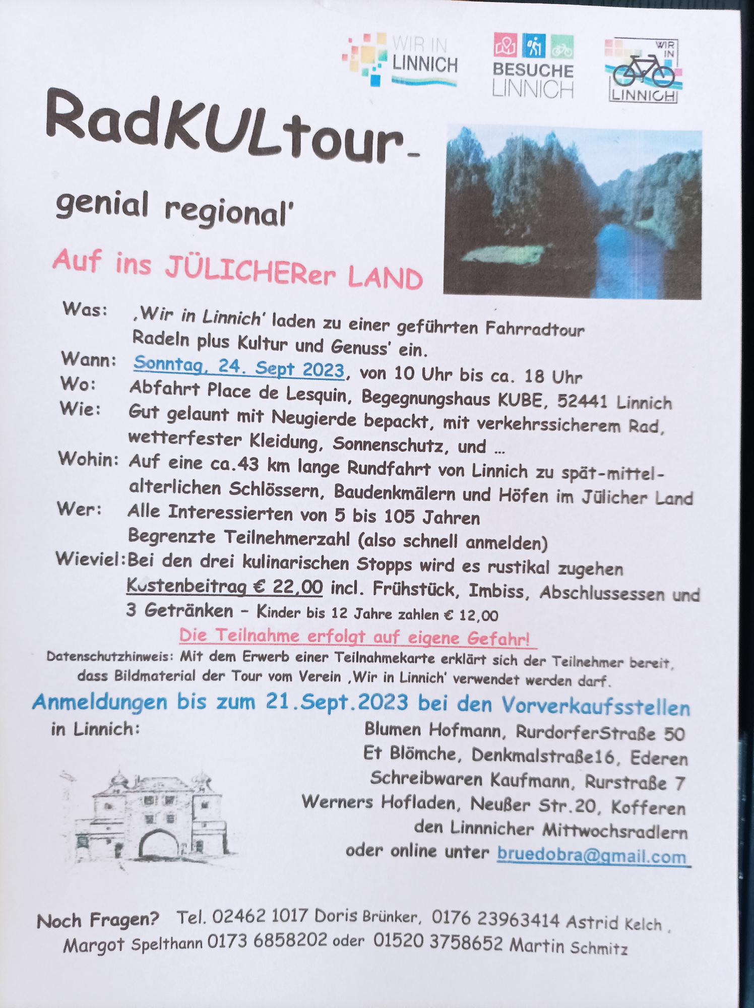 An dieser Stelle finden Sie unser Faltblatt zur Tagestour in Linnich. Sie finden darin Sehenswürdigkeiten, beispielhafte Tagesausflüge und Empfehlungen rund um unsere kleine Stadt.
